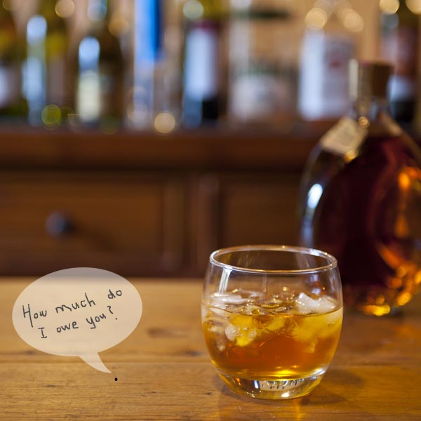 The bartender pours him a stiff one.